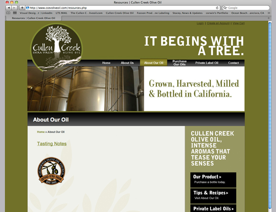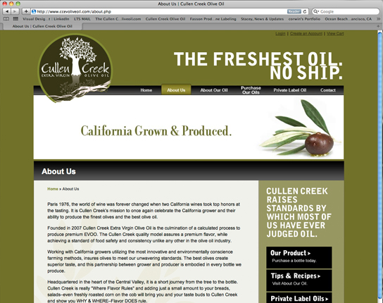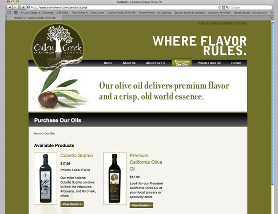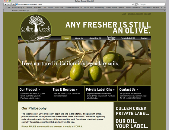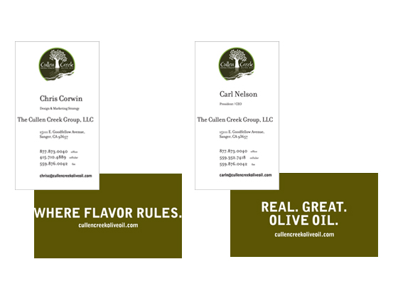 Cullen Creek Olive Oil is a California Olive oil producer based in Sanger, Calif. These independent producers own their own mill and contract with family farms across the central valley to produce a premium oil from 3 varieties of olives. We were asked to help inject new life into the material Cullen Creek already had, the logo and labels. We wrote new, cheeky copy and avoided the oil and bread and basket beauty shots in favor of what Cullen Creek is, Where Flavor Rules. From there it has been a rapid rise. Check in with us at : ccevoliveoil.com & http://www.facebook.com/pages/Cullen-Creek-Olive-Oil-of-California/
