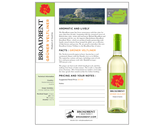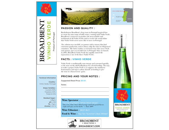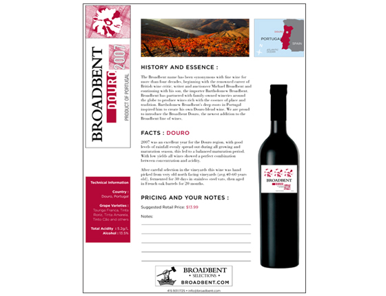 Broadbent Selections is a wine importer that enjoys bringing small, family owned and operated wineries from around the world to the United States. In addition to importing other labels, Broadbent has imported Vinho Verde, Port and Madeira under the Broadbent name. We recently collaborated to initiate a more comprehensive, Broadbent Brand as the Broadbent Malbec, Gruner Veltliner and Douro arrive. The flower has been a part of the best selling Vinho Verde for many years. Building on that; and additionally using color, and other printing techniques, the flower will become a symbol for high quality, great tasting wine varietals.